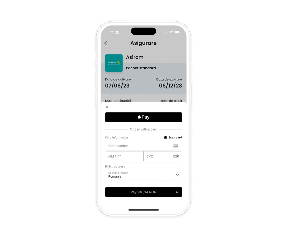 - Ai opțiunea unei plăți instanțe și sigure prin Apple Pay și Google Pay fără să mai fii nevoit să introduci datele cardului tău sau să faci un transfer bancar și să plătești comisioane bancare adiționale.